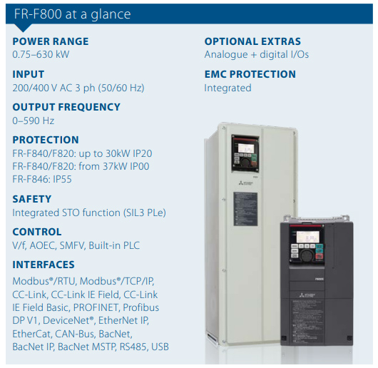 outstanding features of these powersaving frequency inverters include their simple but safe operation and start-up, perfect control management and optional network-capability. The FR-F846 frequency inverter with a protective structure of IP55 is suitable for use under harsh environmental conditions.